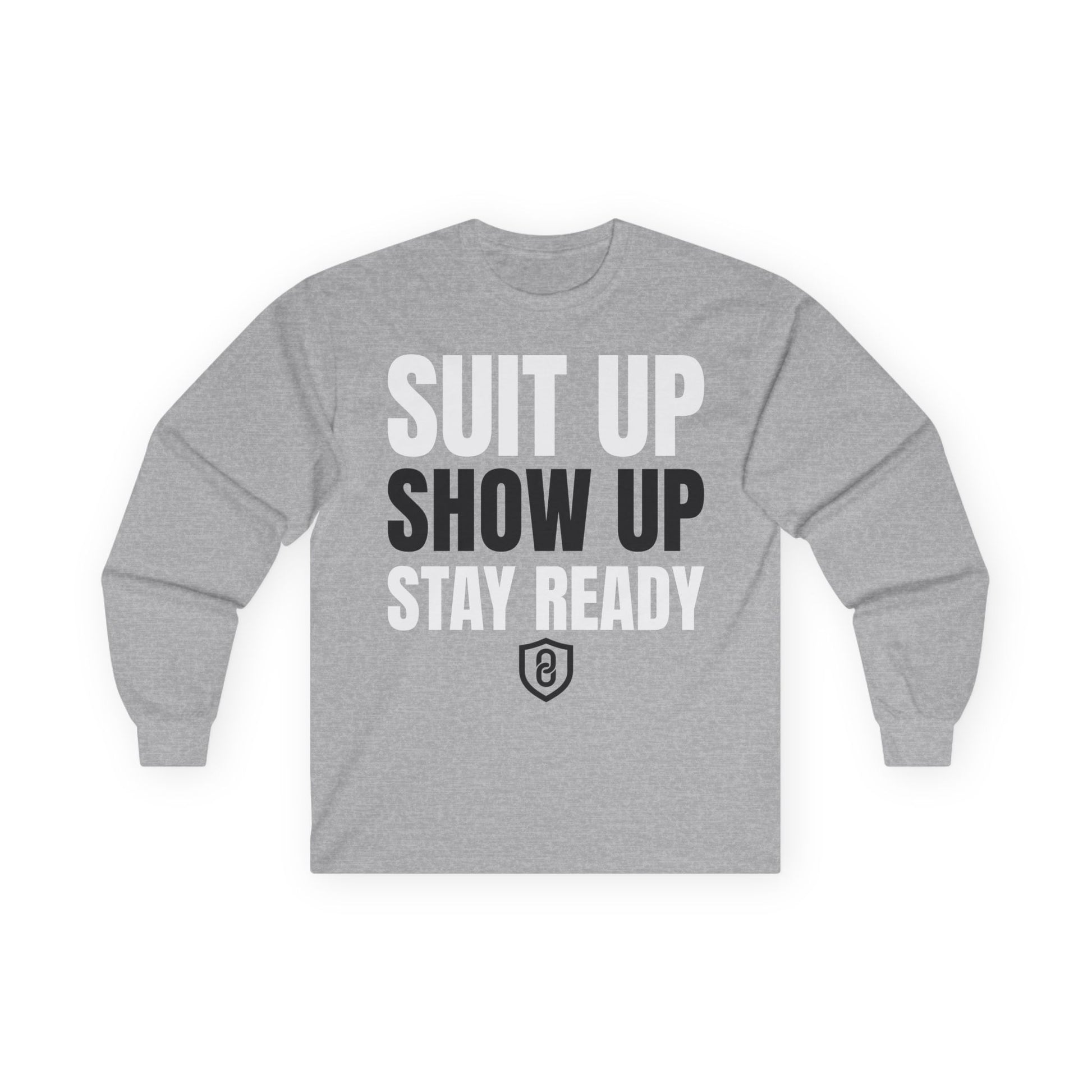 • “Suit Up. Show Up. Stay Ready.” printed in black, white, and gray