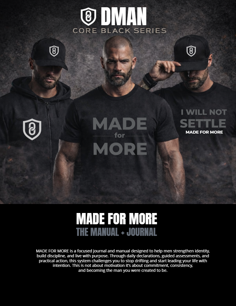 DMAN CORE BLACK – MADE FOR MORE Manual + Journal is a focused, no-excuses system designed to help men strengthen identity, build discipline, and lead their lives with intention. Built for daily use, this set moves you from reflection to action—one decision at a time.